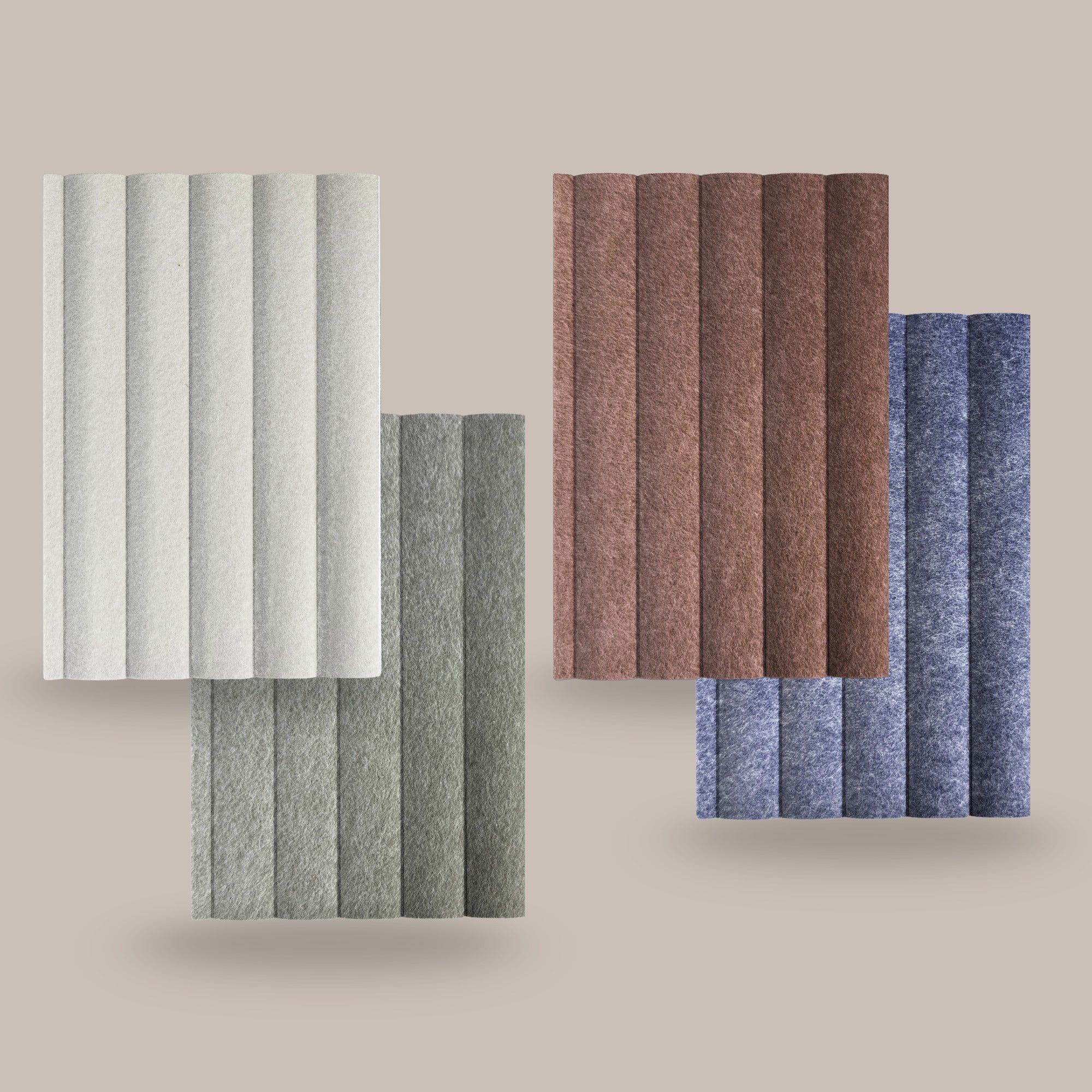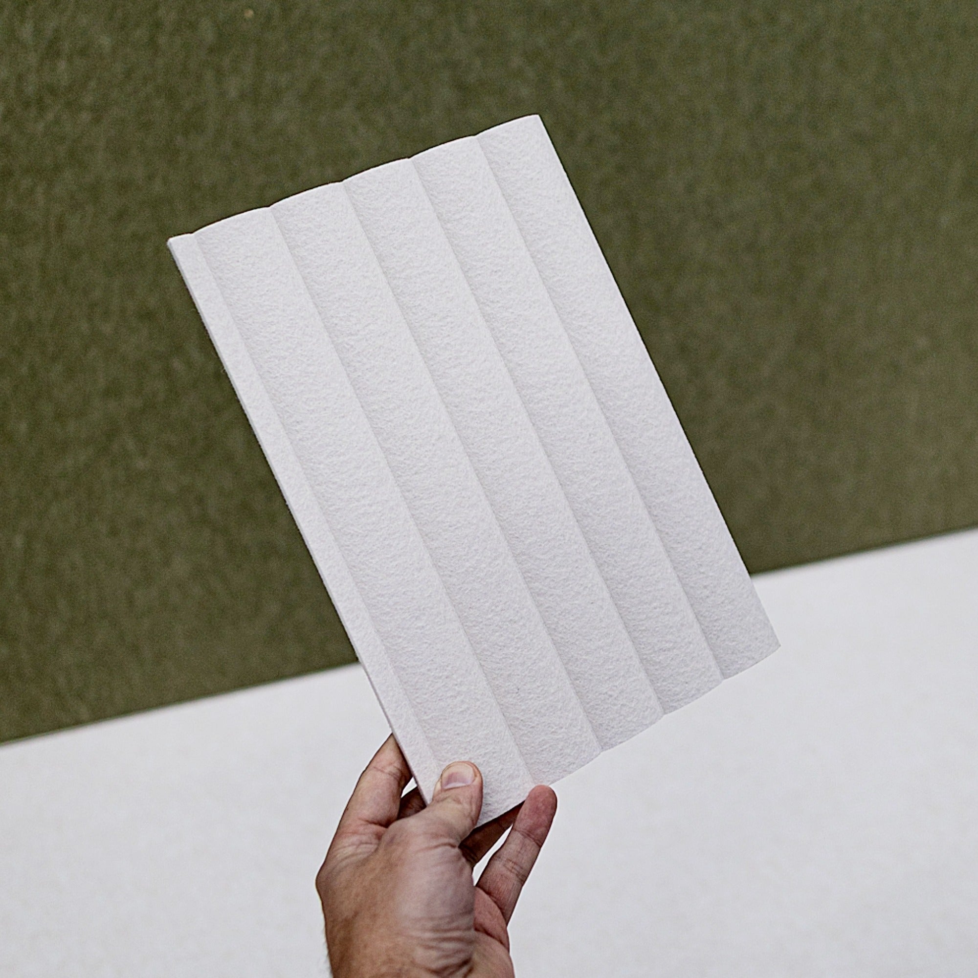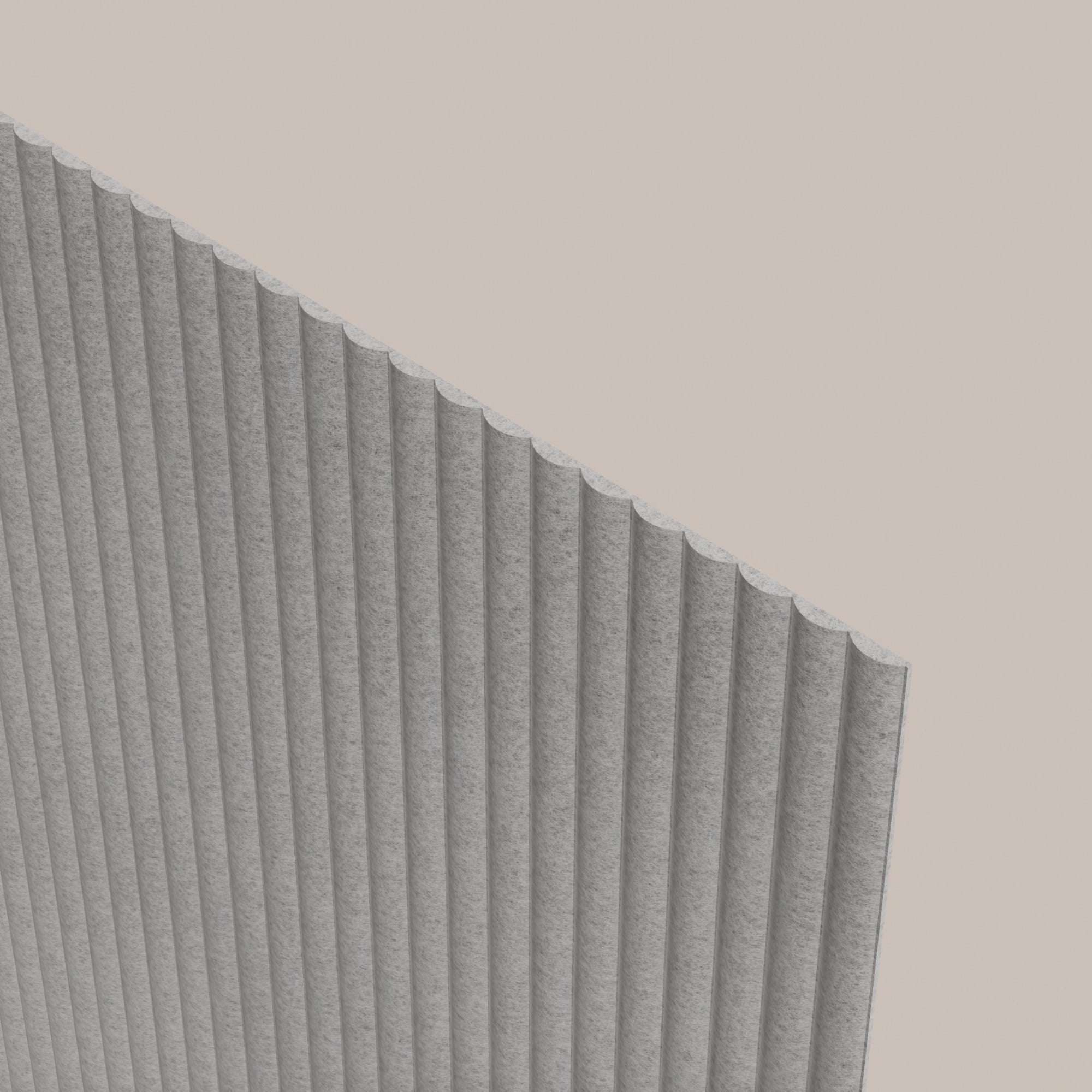 De Curved RIDGE herken je direct aan de diepe verticale ribbels. Het PET-vilt wordt onder hoge druk in vorm geperst waardoor een strak en duidelijk reliëf ontstaat. Dat ziet er niet alleen mooi uit, maar werkt ook verrassend goed tegen galm.
