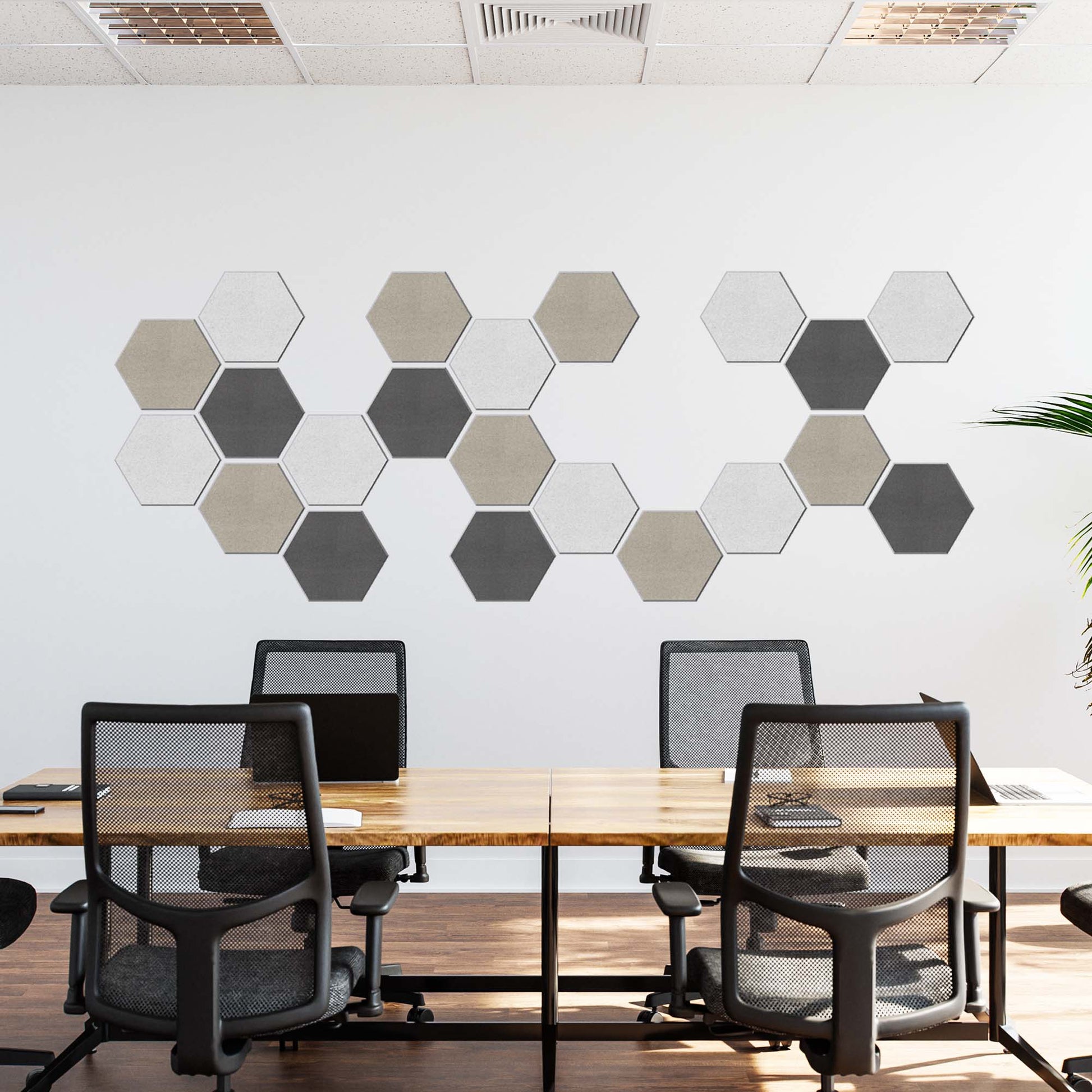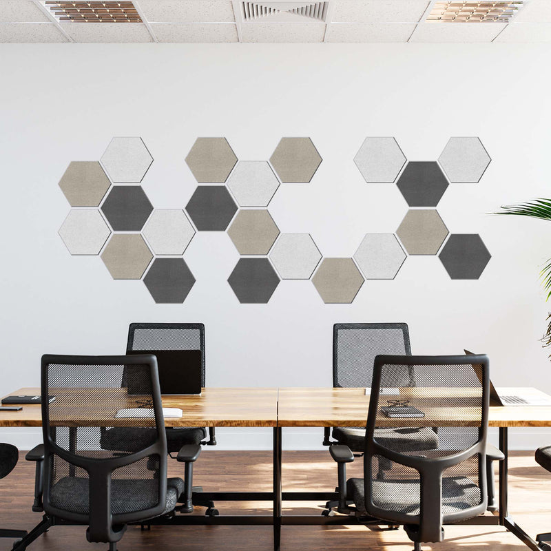De hexagon is een populaire vorm die speelsheid en structuur moeiteloos combineert. Door zeshoeken te herhalen of af te wisselen in kleur, ontstaat er een visueel sterk ritme aan de wand. De zachte PET-viltstructuur verbetert de akoestiek door storende galm te reduceren, waardoor de ruimte rustiger en aangenamer aanvoelt. Ideaal voor kantoren, onderwijsruimtes of creatieve werkplekken.
